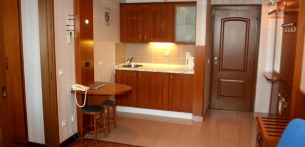 В номере: 2-спальная или две 1,5-спальные кровати, тумбочки, бра, коврики, туалетный столик, два встроенных платяных шкафа, кондиционер, радио, выход на балкон (летняя мебель), диван (еврокнижка), кресла, TV на тумбе, кондиционер, внутренний телефон, журнальный стол, торшер, бра, картина, кухня-студия(корпусная мебель с холодильником, мойкой, набором столовой и чайной посуды, электрочайник, барный стол и стойка, 3 стула), паркетный пол, ковер, выход на балкон, прихожая(вешалка для верхней одежды, зеркало, багажная тумбочка).