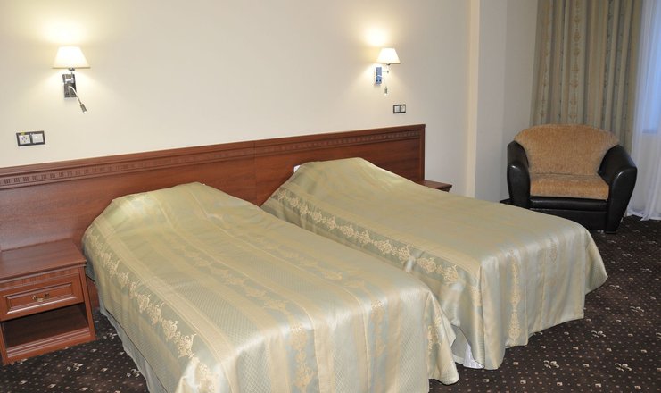 В номере: две удобные отдельные кровати (100х200 см), которые при необходимости легко можно соединить в одну двухспальную (200х200 см), две тумбочки, журнальный столик, два стула и письменный стол, настольная лампа, шкаф с зеркалом, ЖК телевизор, телефон, стеллаж, мини-бар, электрический чайник,   набор посуды, сейф, бесплатный wi-fi, кондиционер