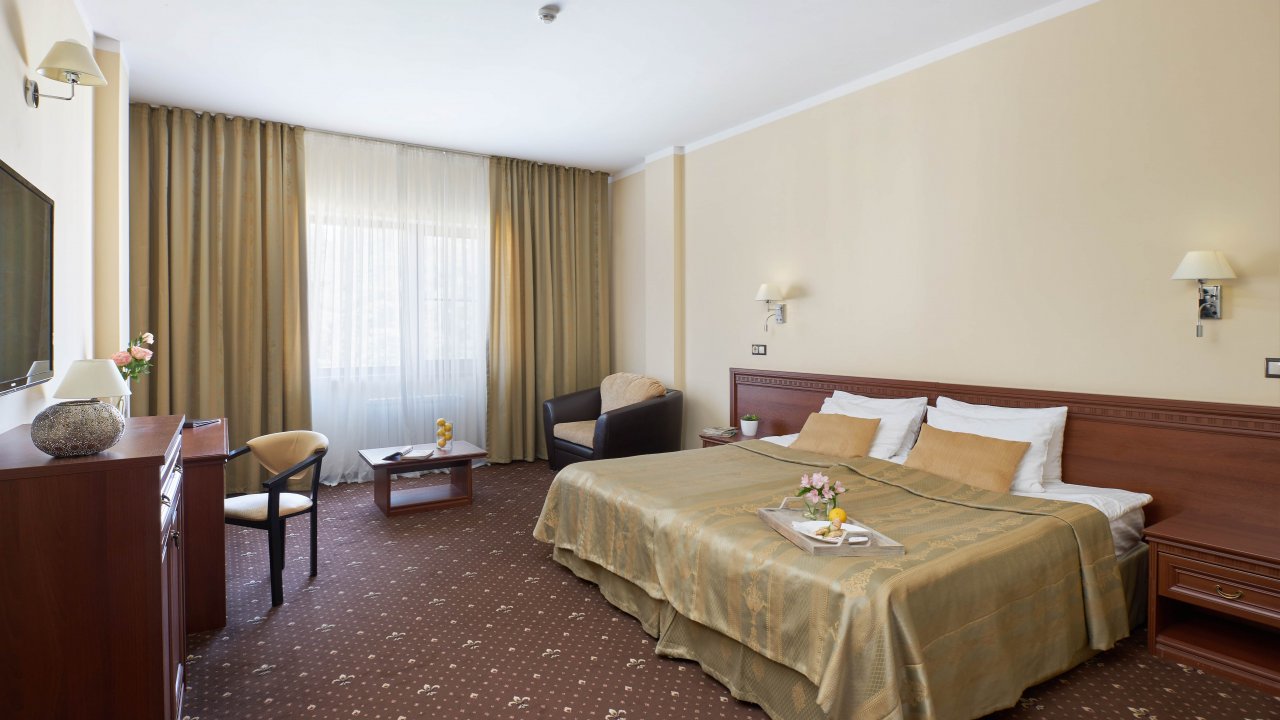 В номере: две удобные отдельные кровати, две тумбочки, кресло-кровать, журнальный столик,два стула и сьменный стол, настольная лампа, шкаф с зеркалом, ЖК телевизор, телефон, стеллаж, мини-бар, электрический чайник, набор посуды,сейф, бесплатный wi-fi, кондиционер